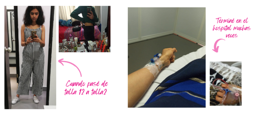 Quise hacer mil dietas, quité carbohidratos, hacía ayunos, dejé de cenar, tomé muchos «tés adelgazantes», usaba horas y horas un corsét que no me dejaba moverme o respirar, tuve bulimia, hacía ejercicio a la madruga y en secreto, si comía «mucho» salía a trotar por dos horas…. Todo empezó a salirse de control, porque perdí mi periodo, mi cabello empezó a caerse, moría de frío todo el tiempo, e incluso me detectaron osteopenia – que es un pasito antes de la osteoporosis – eso antes de mis 17 años!